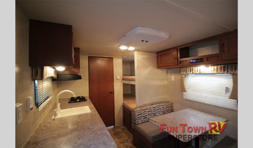 Inside the trailer, you’ll find a queen-sized bed, a dinette that converts into a bed, and a set of bunks tucked into the rear corner providing some unexpected privacy.