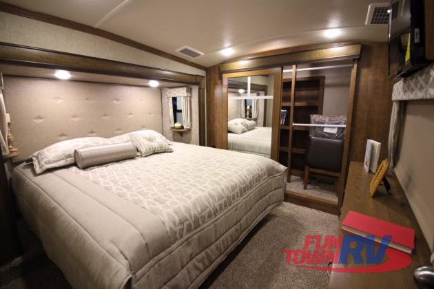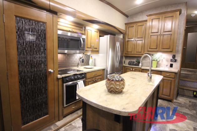 The Cedar Creek Hathaway for Sale at Fun Town RV is an excellent fifth wheel choice for extended living RVers and short term vacationers interested in “glamping”. With a long list of high end options such as a dishwasher, Splendide stackable washer/dryer and 20 cu. ft. french door refrigerator, this attractive coach is just like a home on wheels.