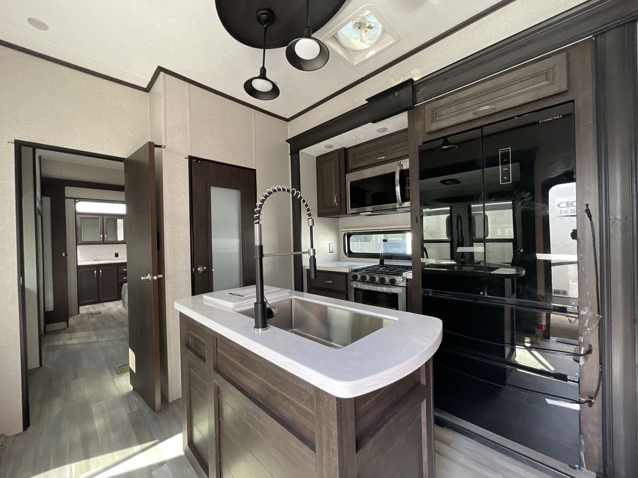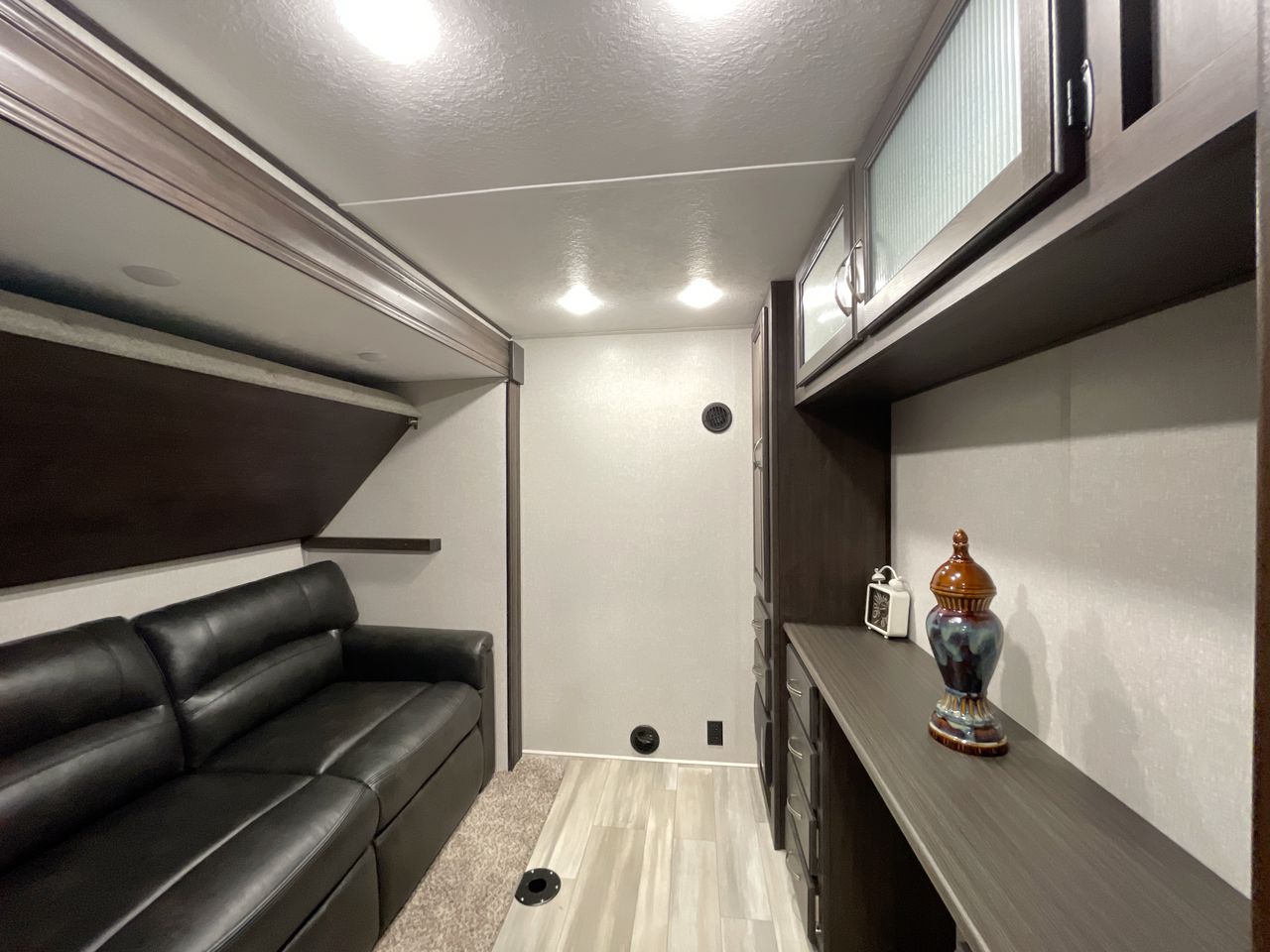 This mid-bunkhouse Coachmen Brookstone 398MBL fifth wheel has sold, but you can order your own at Fun Town RV. Thanks to the second bedroom and the spacious loft, you can easily enjoy multi-family vacations in this RV. The middle second bedroom is a multi-purpose space with a sofa for seating, a desk, a bunk, and plenty of storage space. In the kitchen, enjoy cooking on a three-burner stove and cleaning up at the kitchen island after a meal.