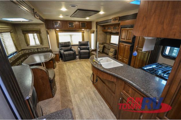This beautifully designed travel trailer includes many high end features in a lightweight package. Enjoy upgraded luxuries such as solid surface countertops, an electric fireplace, residential seating and more!