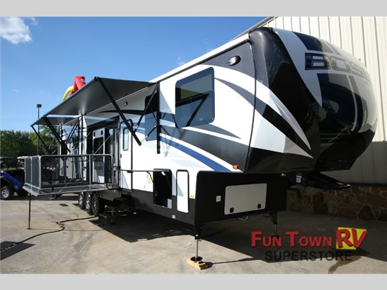 If you can’t bear to leave your favorite ATV, motorcycle, or dirt bike at home look no farther than the Cruiser RV Boss toy hauler fifth wheel. The race experience of the Boss product managers help guide the development to assure that the Cruiser RV Boss toy hauler fifth wheel is functional for racers or any lover of motorsports. The all-new chassis will accommodate all types of cargo including Side By Sides, ATVs, motorcycles, and more! This toy hauler fifth wheel boasts dual slides, a side and rear patio, and a separated 12′ cargo garage with a loft. This is all contained in a 6 sided, welded, aluminum cage construction with a sleek high gloss fiberglass exterior.
