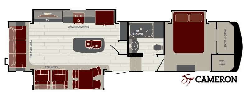 The Cruiser South Fork Cameron Fifth Wheel features triple slides for added interior space, a convenient kitchen island, plus a rear living layout that is ideal for entertaining friends and family.