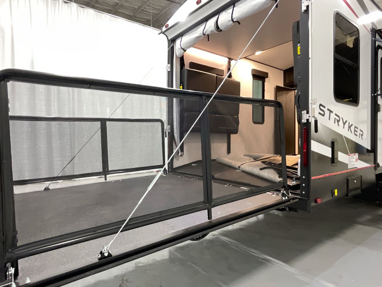 Get all the luxury features you crave inside the Cruiser Stryker ST2313 toy hauler travel trailer. This unit features a master suite with a king bed and a dual-entry bathroom. The power ramp door makes it easy to get your toys loaded and unloaded at the campground. You’ll find up to 13′ 4″ of garage space for your outdoor equipment in this spacious toy hauler travel trailer.
