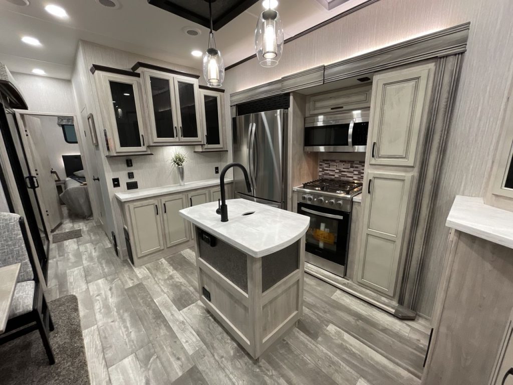 Save over $32,000 on this Forest River Sandpiper 399LOFT destination trailer on sale today. This unit features a rear master bedroom with a king bed and a loft for the kids. There’s a full kitchen with a stainless steel refrigerator, a kitchen island, and a spacious pantry for all your snacks and ingredients. The dual entry doors make it easy to access anywhere in the trailer from your campsite.