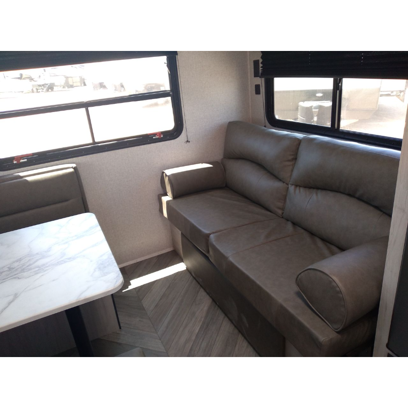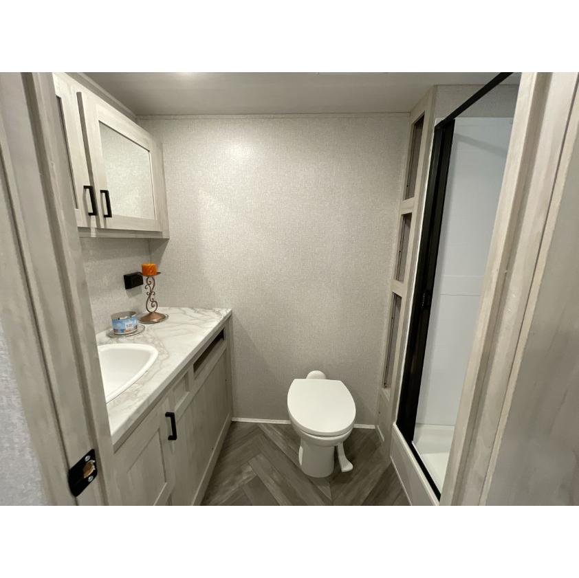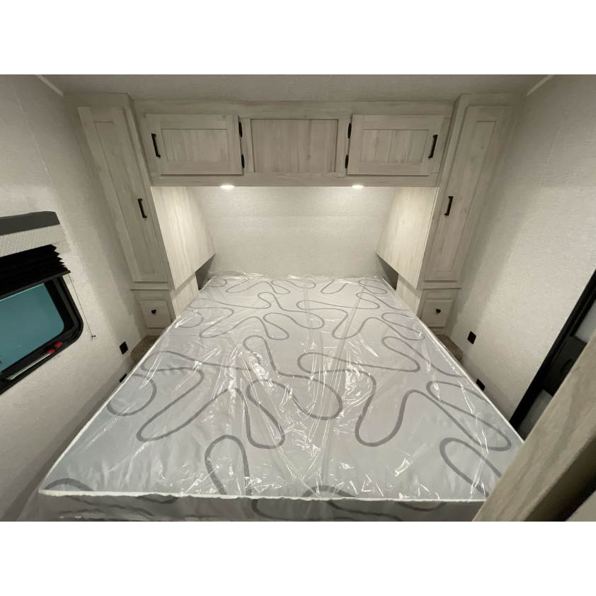 This compact RV is the perfect option for first-time RV owners! It offers sleeping for up to four, which makes it the ideal couple’s coach, and it comes equipped with a king bed! You’ll love that the kitchen offers stainless steel appliances and plenty of cabinet space.