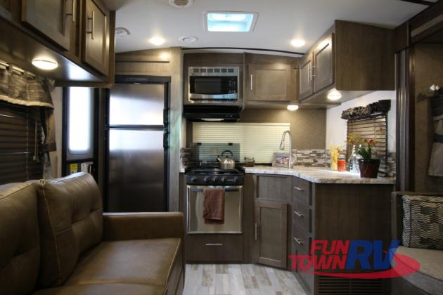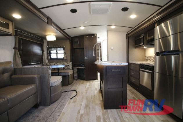 - Designer Décor– Step inside the Forest River Surveyor and you will feel right at home. Luxurious RV living is within reach in this classy and comfortable interior design. Rest easy on plush, residential furniture in the warm and welcoming living room area.