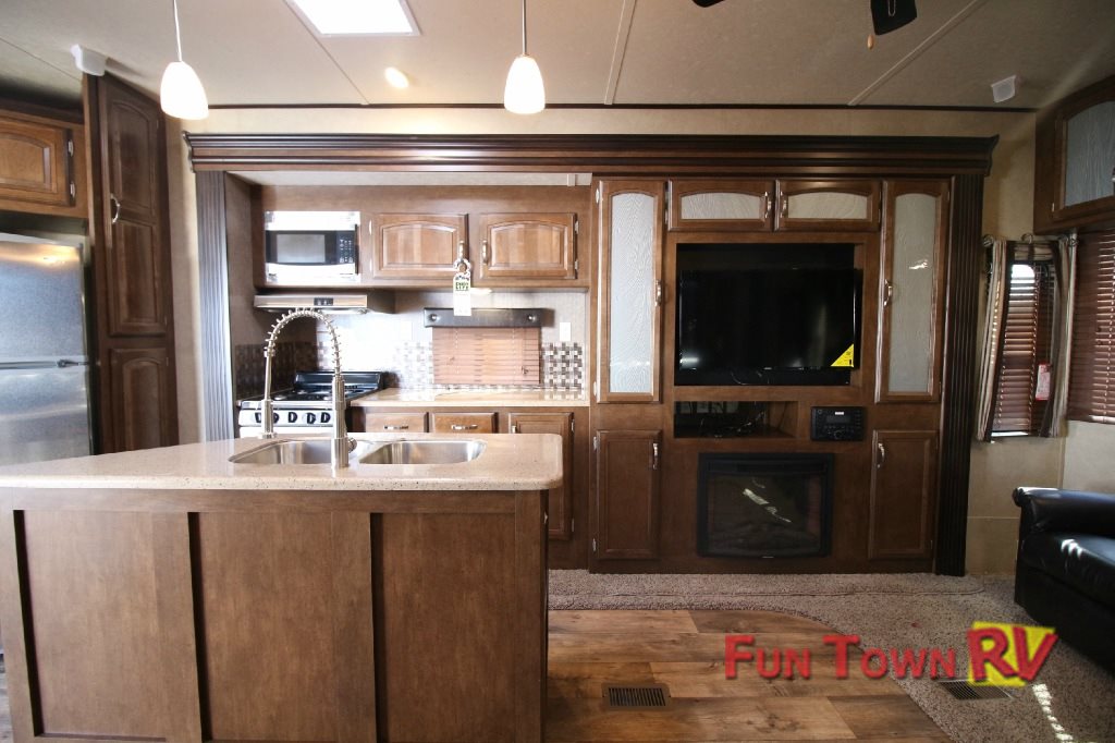 First, the Wildwood destination trailer comes with three separate slideouts and can fit up to seven people comfortably. With a master bedroom and rear bunk house plus convertible sofas, there will be plenty of locations for people to rest and relax with ease. One of the main areas that families like is the rear bunk house, because it comes with not only bunk beds for the kids but they will also have their very own wardrobe and entertainment center to enjoy.