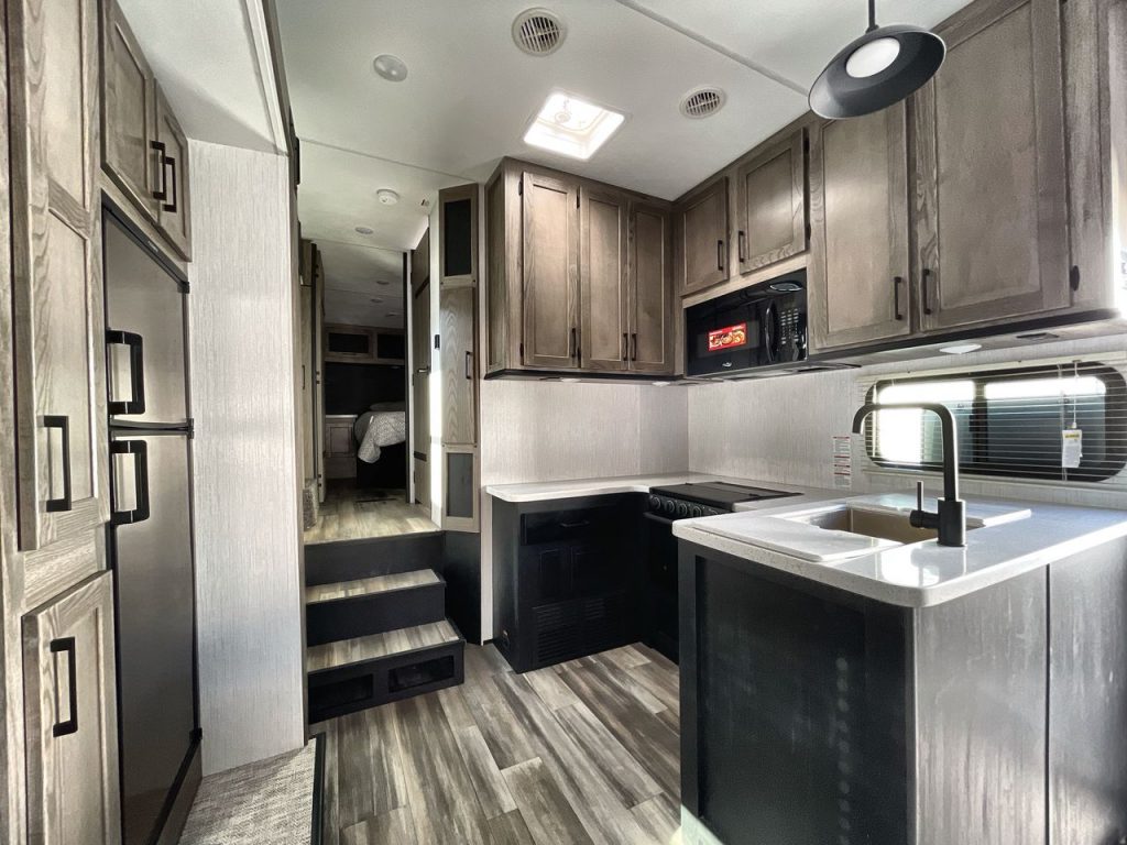 Save over $44,000 on this Heartland Gravity 3610 toy hauler fifth wheel with a 13′ 4″ garage space. The loft over the garage gives you additional sleeping and storage space. The large kitchen offers tons of counter space, and you can keep everyone’s favorite snacks available in all the overhead cabinetry.