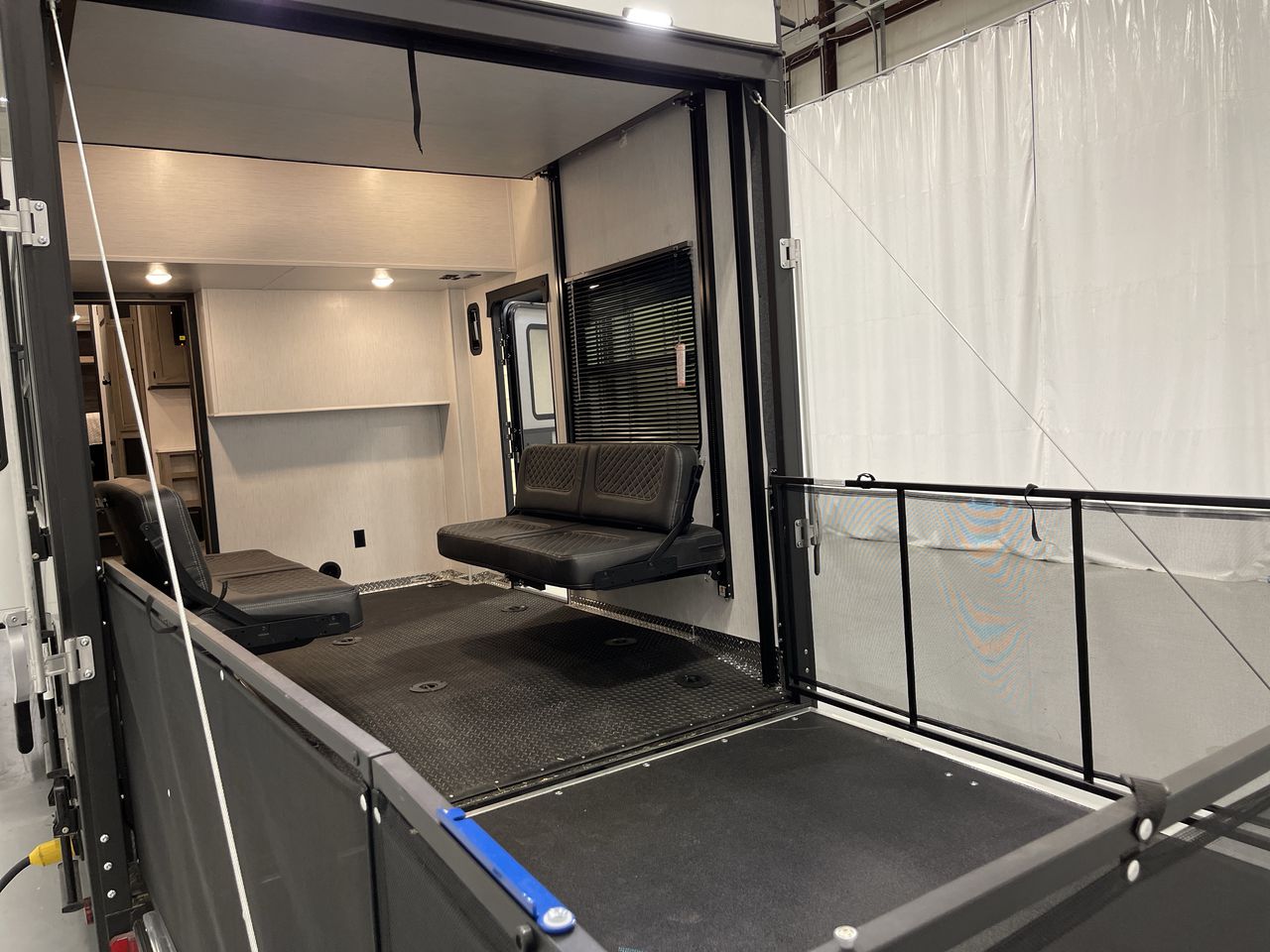 Get more garage space inside the Heartland Gravity 3640 toy hauler travel trailer that features a 12′ 9″ separate garage. This RV makes the perfect multi-family vacation and features an electric queen bed in the garage, so the space easily transforms into a second bedroom for your guests.