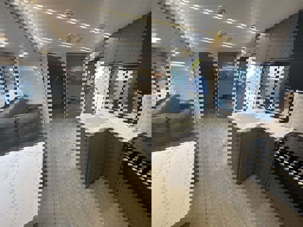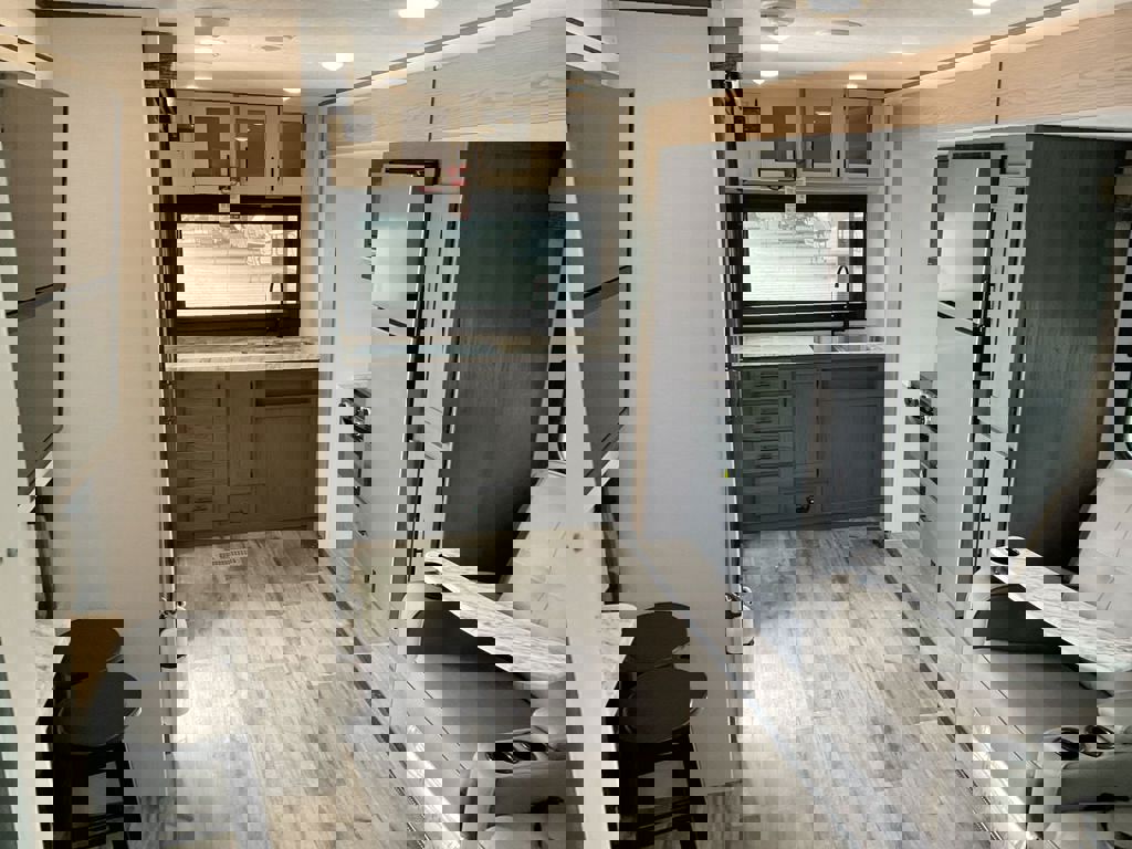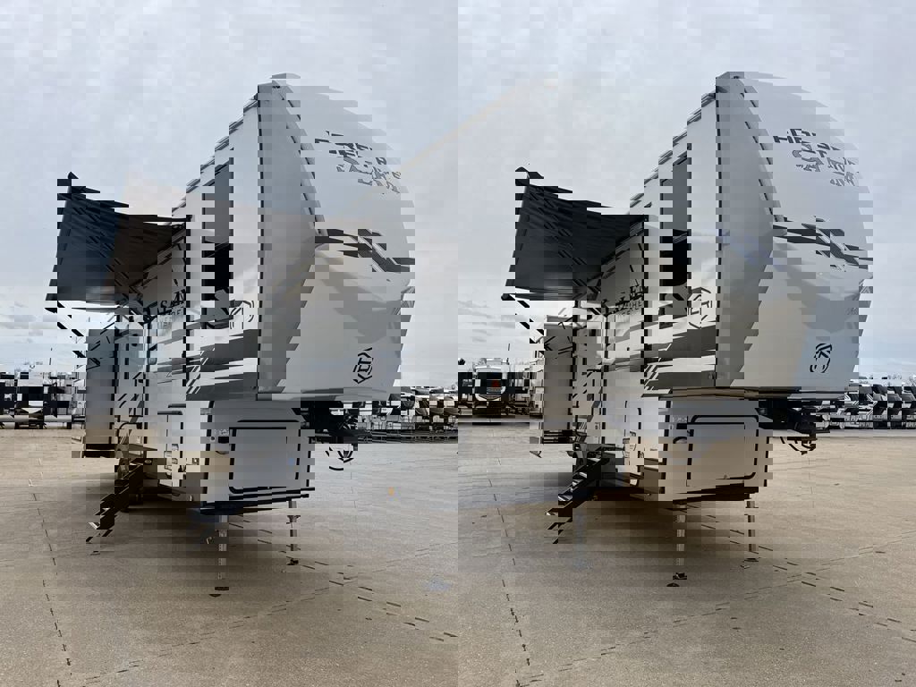 The Salem 356QB is the bunkhouse fifth wheel you are looking for to accommodate your family and your pets! This camper has some great features that you might want to look out for in your next RV. The 356QB is a family fifth wheel; it has washer and dryer prep, big bunkhouse, and a secondary full bathroom. This goose neck trailer is great for pets because of the rear entrance second full bath. The secondary bathroom is in the rear of the camper connected to the bunkhouse. Why I am saying this is great for pets and families is because if your dog ends up messy and gross after being at the lake or out hiking all day, the secondary bathroom is a full bath. This full bath has a tub/shower combo with a deep tub to hose off your dog before letting them into the camper. The mess will be contained to this shower/tub and easily be hosed off after ready for the next person to use it. You would have to walk through the bunkhouse to access the rest of 356QBS but while you’re there this bunkhouse has a bunk bed, flip-up bunk, and a Versa-Queen Convertible Bed/Sofa. Across the flip-up bunk and the versa Queen there is an entertainment center with extra storage beneath and a wardrobe next to it. Now you walk through to the main living area, there is a pantry to your right and to your left is the Family-Size U-Dinette that can be made into an extra bed if needed. Next to the U-Dinette is a Tri-fold sofa that can also be opened up into another bed. Right by the couch is the entertainment center with a 50” TV and fireplace. As you turn to the kitchen you’ll see some great features: 16 CU FT 12V Double Door Fridge, great stove top and oven combo, wine rack, and tons of storage. Uniquely you have a four burner stove top with a big oven underneath – this is rare with RVs, you don’t see this too much outside of high end campers! There’s also a stainless steel single basin sink, you’ll also see black and gold fixtures – striking against the lighter tones! As you move through the main living area to the main bedroom you will past the other main full bath that has a Walk-In Residential-Style Shower with Skylight, this shower does have a sliding glass door and several shelving options for all of your products. You do have cabinetry space under the sink and extra counter space next to the sink. Now off to the main bedroom that has a Custom King Bed, Front Closest and Shelving that also houses the Washer and Dryer Prep, and there is a dresser in front of the king bed with a TV Hookup above and a bench next to it. While this camper is great indoor living, the Salem 356QB also has great outdoor living. Forest River designed this camper to have a 21’ Single Awning that you can hang out underneath while the chef is cooking out on the pullout griddle while watching the big game. This outdoor kitchen has a great mini fridge, small sink, and cabinets to stash all the supplies you need while you are cooking burgers. There is an easy to use outdoor TV hookup and interior and exterior JBL speakers to be able to tailgate in style. This fifth wheel is great for any lifestyle you can easily host friends and family along with their pets; this 2026 Forest River RV Salem 356QB is what you are looking for in floorplans and features that you need to be comfortable on the road.