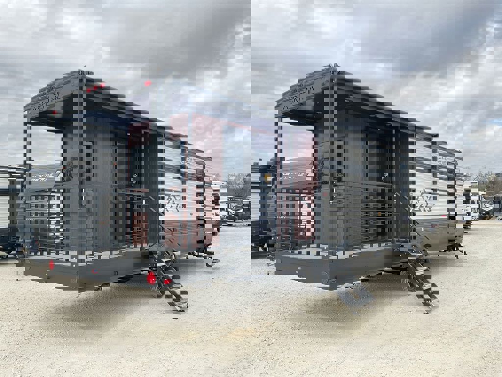 Dutchmen RV’s recently developed new Aspen Trail floorplan, the 3200WAP. This travel trailer is unique because they have designed a permanent fenced wrap around porch. The porch is beautifully designed – wood paneling, pass through window, and a fold down bar top with bar stools. You have room for a couple captain seats and table in between to enjoy a drink or two while listening to the game. While you already have some great shade with the covered porch there is a 18’ single awning that extends off the door side of the porch. The wrap around porch is where the main entrance for the camper is also. This is a dual entrance trailer; the main entrance is off the porch and the secondary is through the bedroom. The sliding main doors open into the rear corner kitchen. The rear kitchen has a stainless steel double basin sink that you look out through the pass through window. There is a 10 CU FT Fridge with a pantry cabinetry next to it. The theater seating with lift top ottoman is across the entertainment center. A secret feature with this floorplan is a hidden murphy bed behind the entertainment center that folds down if needed. As to the front of the camper, you will pass through the bathroom. You’ll see to your left a combo washer and dryer then to the right there is a shower with a skylight to give you a couple extra inches of clearance. As you head out through the bathroom, you end up in the main bedroom. The main features you’ll a Residential Queen Sized Bed, the secondary entry, and additional features. Some of the additional features you’ll see are under bed storage, two closets, and hidden bed side storage great for reading glasses or stashing your book at night before you sleep. Dutchmen RV made a unique travel trailer with this floorplan, a 2025 Aspen Trail 3200WAP, that you don’t see with other campers.