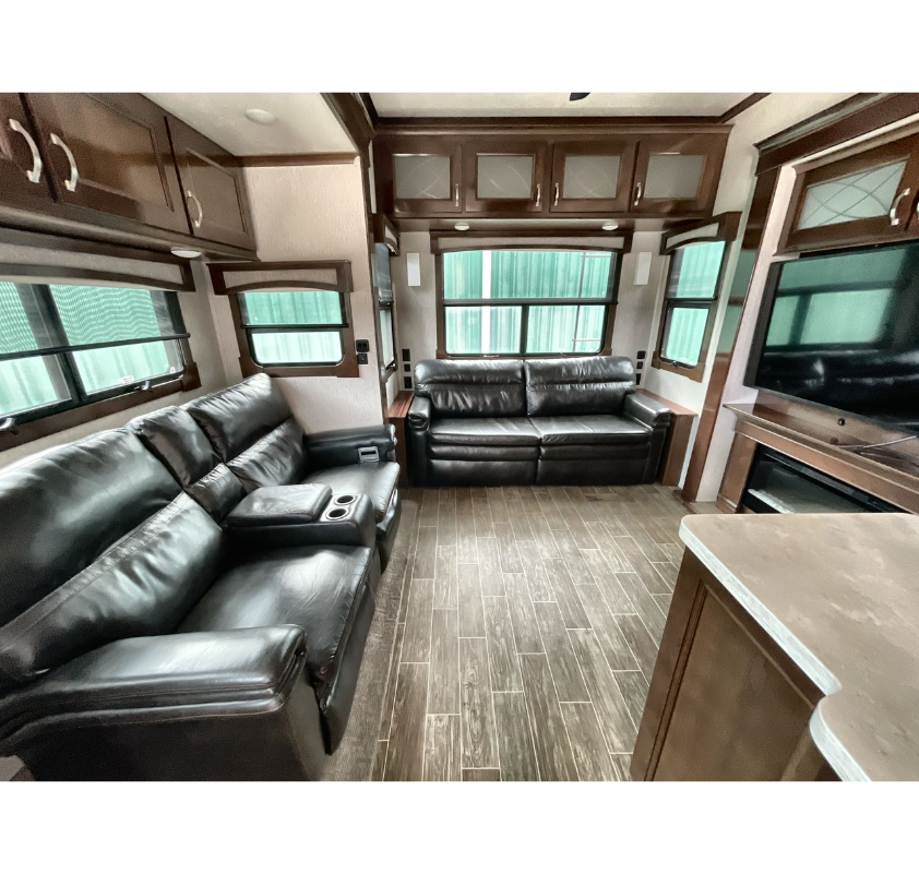 The Redwood Fifth Wheel impresses with its spacious and sophisticated interior layout. It offers residential-style living with high-end furnishings, premium materials, and ample storage solutions available in multiple floor plans. Features include gourmet kitchens with solid surface countertops, deluxe entertainment systems, and cozy seating areas that exude comfort and luxury.