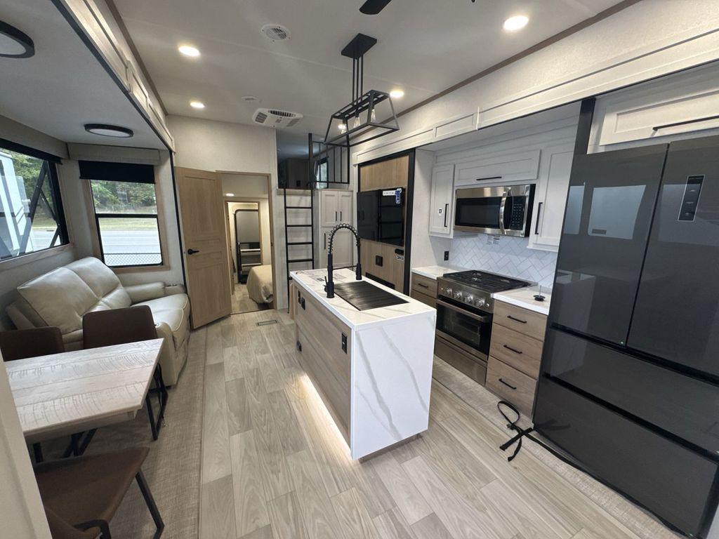 The main bedroom has what you need to be comfortable on your next road trip. The spacious bedroom has 60” 80” Queen Bed slide with under-bed storage. You’ll find a shoe cubby for stashing slippers or extra shoes for the road. You’ll find in the front of the camper there is a walk-in closet with sliding doors. In the walk-in closet are washer and dryer prep in case you want your own for the road! The first full bathroom is just outside of the first bedroom. Some of the features you find in this bathroom are a walk-in shower, linen shelving, overhead cabinets, and more!