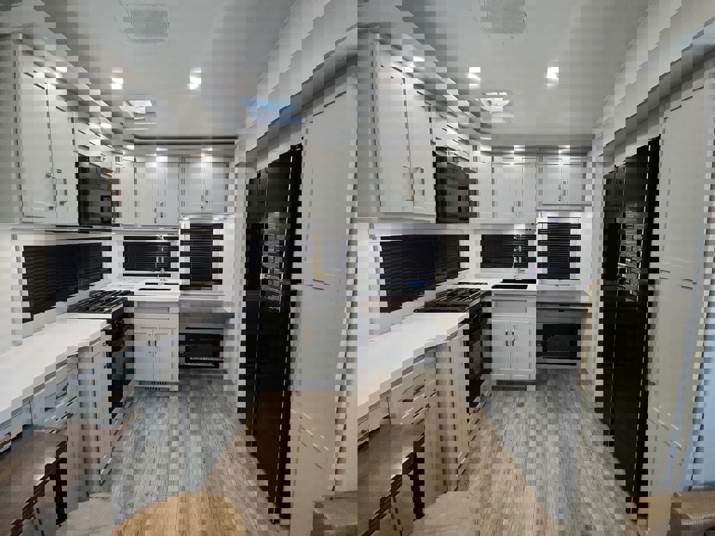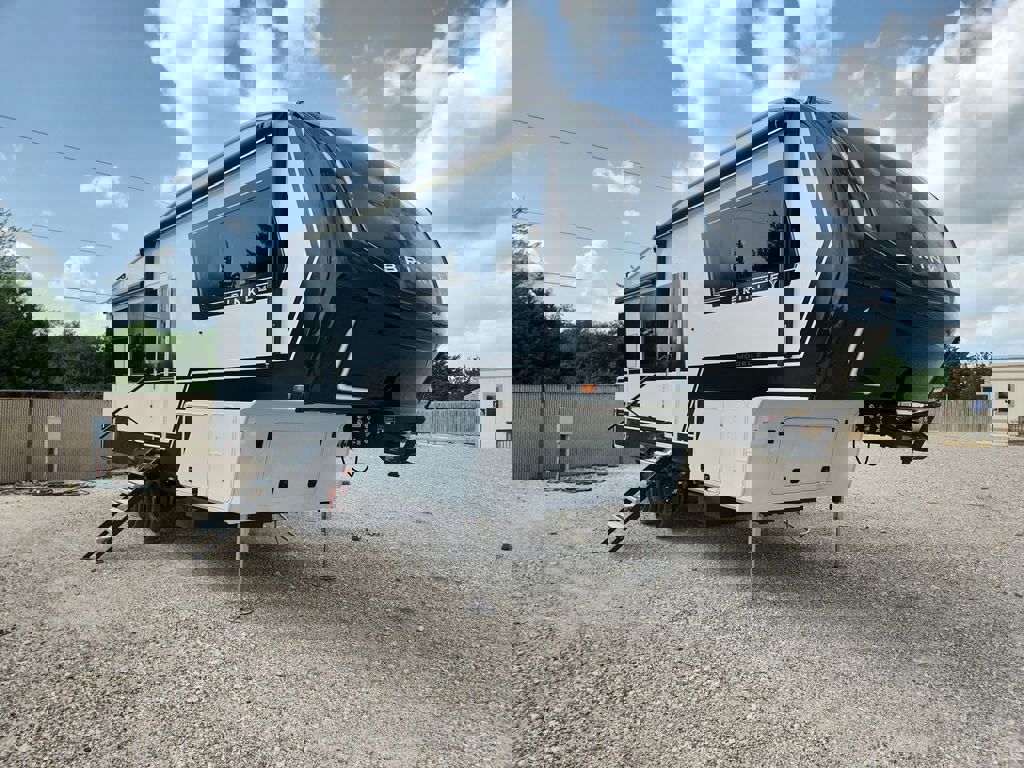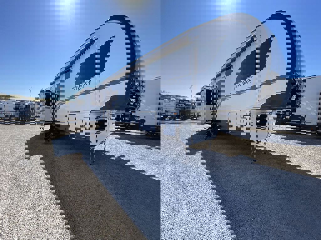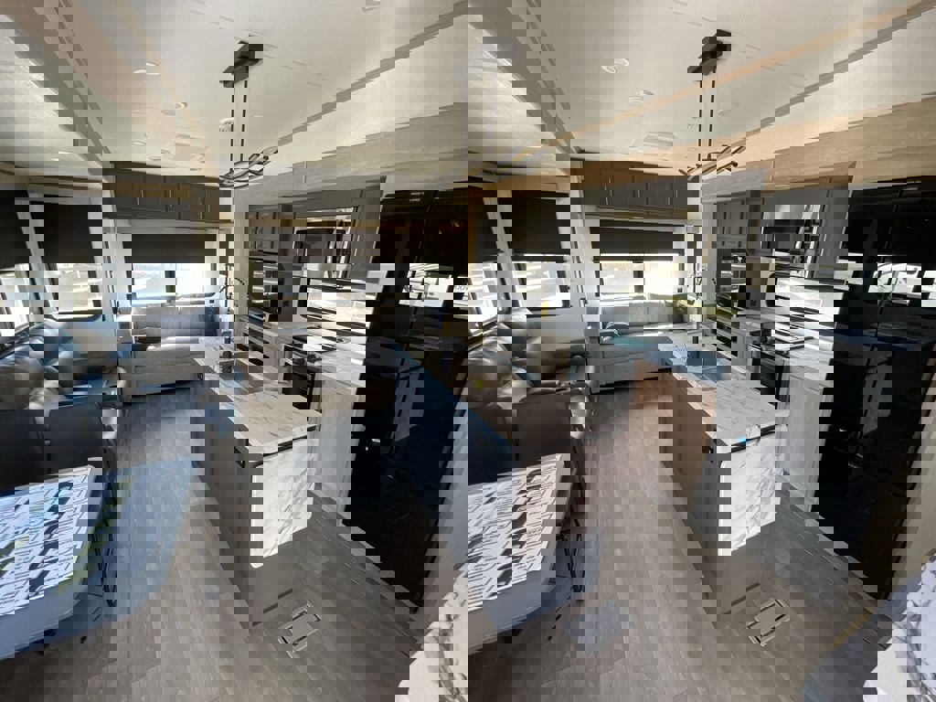 As the exclusive Brinkley dealer of Texas, the Model Z 2680 might have the desk you are looking for! The 2680 floor plan is a front bedroom and rear kitchen layout; the desk in this model resides in the kitchen situated under a window that you can be looking out of while you are catching up and writing emails to send out before you head out for the day. This smaller fifth wheel is designed specifically to be a couple’s coach which means there’s only one bedroom. This couple’s coach has everything you need to be a digital nomad: washer & dryer prep, 16 CU FT Double Door Fridge, and tons of storage. The spacious rear kitchen has several residential sized features like the microwave, big oven, deep sink, and a great pantry located next to the fridge. The kitchen and living room offers a unique table option that can be slid out from underneath the entertainment center that you can pull up ottomans that are a part of the floorplan as seating for the table. As you move to the bathroom and main bedroom, you’ll see a queen bed, extra storage under the bed, washer and dryer prep in the closet, and more. The bedroom is spacious with great storage by having overhead cabinets and night stand cabinets. Along with the four drawers, the bed can be pulled up on hydraulics and you can slide your equipment under the bed. Across the bed there is a bedroom TV and closest where the washer and dryer prep would be. There is a unique pass through from the bathroom to the bedroom where you drop your dirty laundry through when you get cleaned up from a long day out. Brinkley designs their campers with unique features like an all rain shower head, an extra removable shower head, and shower products shelving baskets. You do have small linen closest above the sink that you can stash all of your daily hygiene products in. There is extra storage under the sink: a good size cabinet and extra drawers to put in all of your makeup and face wipes. The interior floorplan is great for couples who are ready to hit the road at any time.