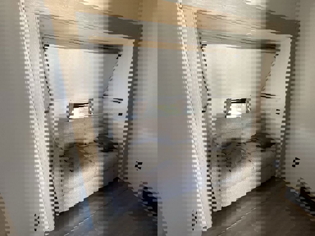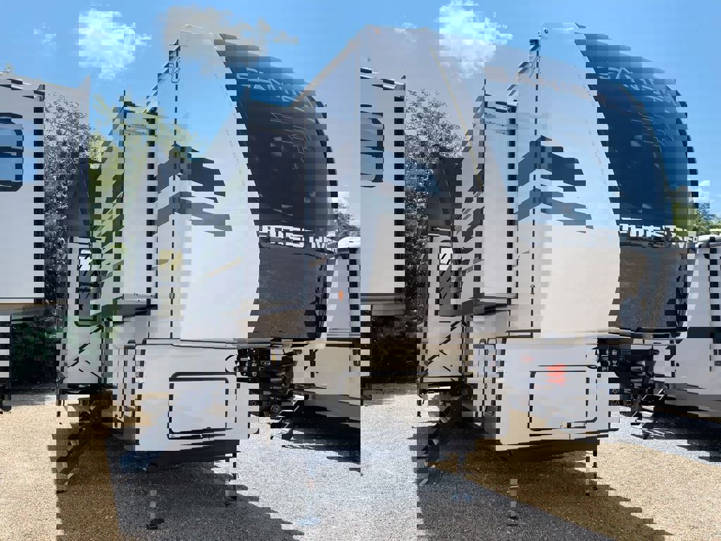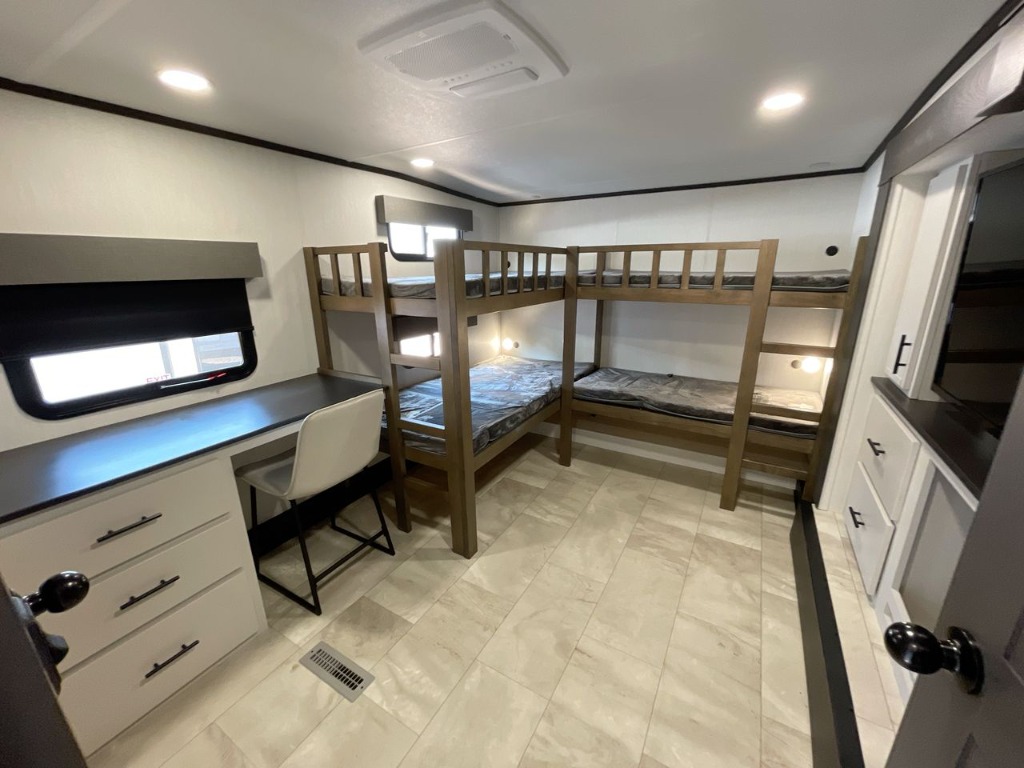 The next model in the line up of floorplans with desk is the Prime Time RV Sanibel 39BUNK: a family camper featuring a spacious bunkhouse, massive five seat couch, and stackable Washer & Dryer Prep. This unique floorplan is a front quad bunkroom which is a massive bunkhouse with four bunkbeds, has a massive entertainment center that holds a 4K Smart TV on a big slide out – you’ll have so much floor space that you won’t know what to do with it! There are tons of storage options in this bunkhouse ranging from the cabinetry in the entertainment center and the open space under the residential sized bunks allows you to get bins and safely store clothing, hiking equipment, or any toys you don’t always want out. If you’re wanting to travel more during the school year, your kids will have a great desk to complete their homework on or study for the big test the following week. This spacious desk has three big drawers that can hold all of your study materials or crafting supplies for your younger kids to use during quiet time. This spacious desk is long so you can easily slide over different crafting projects or textbooks out of the way for the next person to easily use. There is also a great window to be able to look out on when you need a small break from working. Next to the desk is a half bath – great for a late night bathroom run so you won’t wake up in the middle of the walk across the bedroom. This is a great family RV: it has a five seat couch recliner, has a unique pullout bar top table that helps save space in the camper and allows you as a family to still be able to sit around the table at the end of a long day out. There is also a great four burner stove top with a big oven. Next to the oven there is a 12V French Door Fridge with two pull out freezer drawers. There is also a wide pantry and hutch cabinetry for extra storage for plates and cups. A feature not seen often in campers is a built-in wine rack above the microwave where you can stash your bottles when you are parked at a campsite. Next to the kitchen is the entertainment center with a 50” 4K Smart TV with an electric fireplace below. A unique feature in this Prime Time RV fifth wheel are three large 4K Smart TVs – you don’t see this combination a lot in most major RV manufacturers. There are also spacious clothing storage options like sliding door closet or tall cabinetry above the second standard size fireplace; there are also available overhead cabinets above the king size bed. As you head through the main bedroom you will enter the rear full bathroom with a dual vanity, walking shower, and stackable washer & dryer prep. This bath room has a big linen closet so you can stash all your towels, sheets, and medicine you might need on the road. The big mirror on the rear wall is great! You never have to worry about sharing the mirror when trying to get ready in the morning. The spacious shower has several great features like product shelving, easy to clean shower, and removable shower head so you can easily get the dirt off or give your dog a bath after hiking all day. If you’re in the market for a family friendly fifth wheel then look no further at the 2026 Prime Time RV 39BUNK.