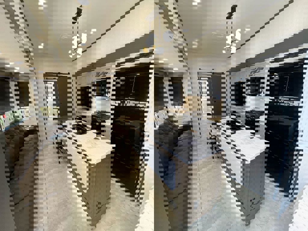 If you’re looking for a spacious camper come to a Fun Town RV dealership and walk the KZ Ridgeway 36MB fifth wheel. This spacious mid bunk floorplan has everything you need to comfortably be able to work from home. Mid bunkrooms are traditionally used as another designated sleeping area but I’m here to say you can use this room as a study so you can WFH in private and be able to take calls and host meetings comfortably without interruptions. In this bunkroom you have a built-in desk that has storage all around for you to be able to stash files, notepads or any equipment you might need. If you are working off a laptop and you don’t want to be facing a wall while you write emails, there’s a plush couch behind you with a small window to look out through. This bunkroom is a multi-purpose room with a flip down bunk for guests and a couch that converts into a bed for guests. This is not the only extra sleeping spot though the couch on the rear wall opens up to be an extra bed. As you move out to the living room and kitchen, you’ll see several features you’d expect when you’re at home: comfy theater seating, great four seater table, French door fridge with a freezer drawer, hutch and extra cabinetry space, and deep stainless steel sink. KZ went with striking design choices for this Ridgeway floorplan: a beautiful marbled white and gray stone that pops against the charcoal and white oak cabinets. Now you have to check out the living room, leather theater seating and fabric covered foldout couch. The theater seating has great features like cup holders, electric recliners, and remote holders to stick the remote there before you head out on the road towards your next destination. There are so many windows in the kitchen and living room. If you end up being stuck in the camper all day you’ll be able to open up the blinds and still enjoy the outdoors. There are overhead cabinet options in both the kitchen and living room so you’ll be able to stash snacks and board games when not in use. After looking around the main living area, you head to the main bedroom with several features: king bed, residential shower, washer and dryer prep, and a big front closet. There is great storage in the 36MB between the big dresser and front sliding door closest you’ll be able to bring bulkier clothing easily and be on the road longer. As a digital nomad, you really can be anywhere so you can be in regions that need more layers or sunnier areas that don’t need warm clothing but you might need more equipment to go hiking. With this floorplan also you have bedroom and hallway access to the bathroom. Both entrances of the bathroom have sliding doors so you can move around quietly in the night for midnight bathroom runs. KZ is known for striking design choices and you won’t be disappointed with their Ridgeway 36MB fifth wheel; come by your local Fun Town Dealer and check out our KZ models today!