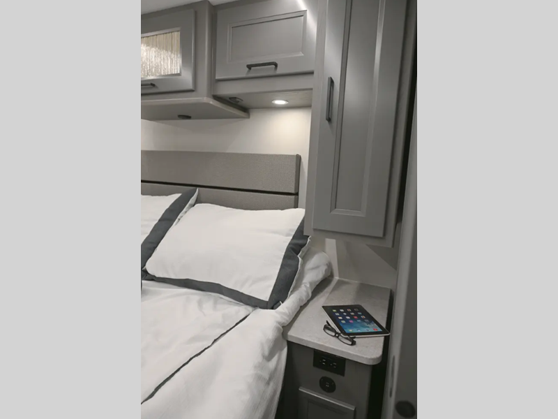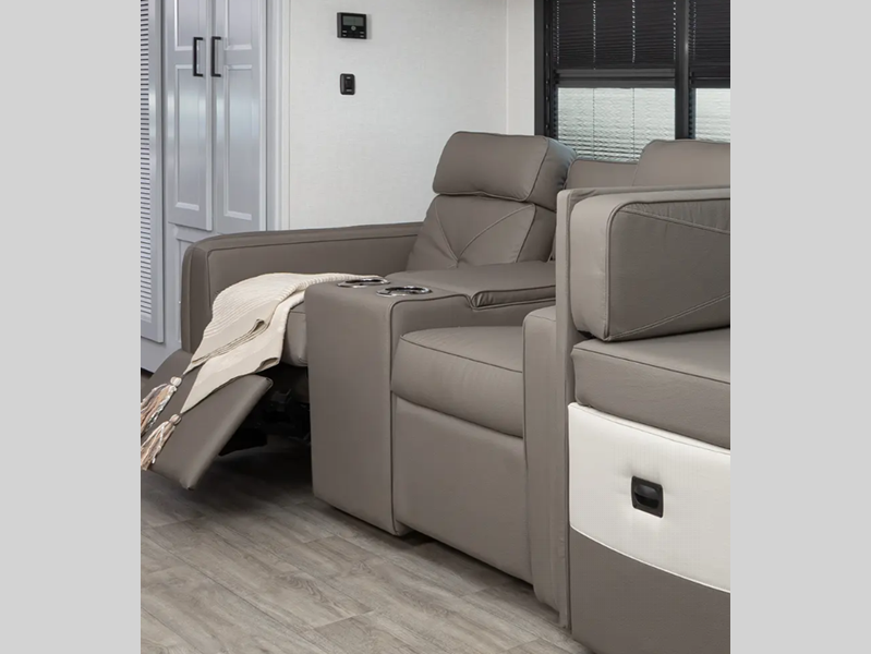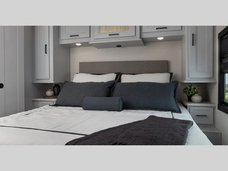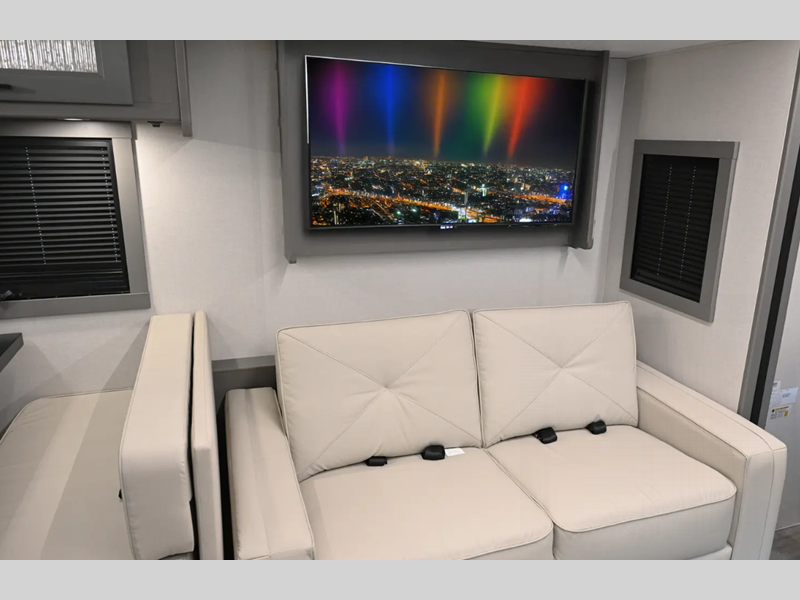 You'll love the beautifully appointed kitchen with tile backsplash and stainless steel appliances, and the private bedroom includes an impressive king-size bed and designer headboard for all-around comfort. A 10" touchscreen radio and reclining/swivel captain's seats make the drive smoother than ever, along with cruise control, traction control, and a tilt and telescoping steering wheel. Head outdoors to find a full basement with a pass-through storage, a power patio awning, automatic leveling jacks, plus many more convenient features.