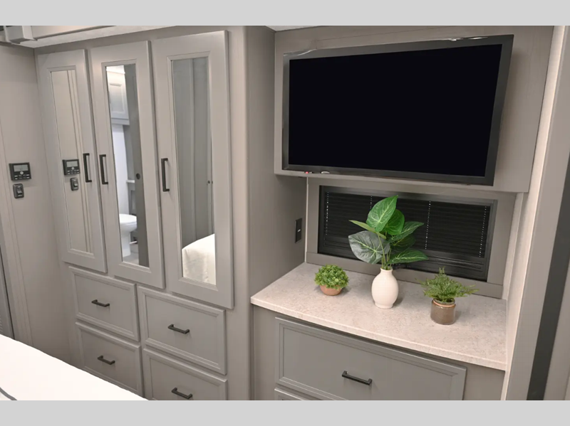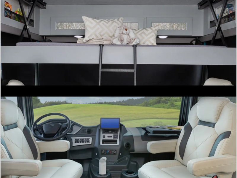 Sleeps 6 Slides 1 Length 34 ft 10 in Ext Width 8 ft 6 in Ext Height 12 ft 5 in Interior Color Champagne, Mocha Exterior Color Partial Paint Option. Full Body Paint; Glaucous, Graphite, Scarlet. Night Moves (Limited) Hitch Weight 8000 lbs GVWR 22000 lbs Fresh Water Capacity 70 gals Grey Water Capacity 45 gals Black Water Capacity 45 gals Tire Size 22.5 Furnace BTU 30000 btu Generator 5.5kw Gas Fuel Type Gasolline Engine 7.3L V8 Chassis Ford F53 Horsepower 350 hp Fuel Capacity 80 gals Wheelbase 228 in Number Of Bunks 1 Available Beds King Torque 468 ft-lb Refrigerator Type Stainless Steel Residential Cooktop Burners 3 Shower Size 32" x 32" Number of Awnings 2 Axle Weight Front 7500 lbs Axle Weight Rear 13500 lbs LP Tank Capacity 84 lbs Water Heater Type On Demand TV Info LR 40" Smart TV, BR 32" LED TV, Ext. LED TV Awning Info 15' & 10' Power Washer/Dryer Available Yes Gross Combined Weight 26000 lbs Shower Type Radius Electrical Service 50 amp Similar Floorplans
