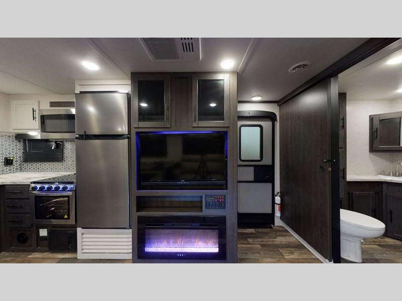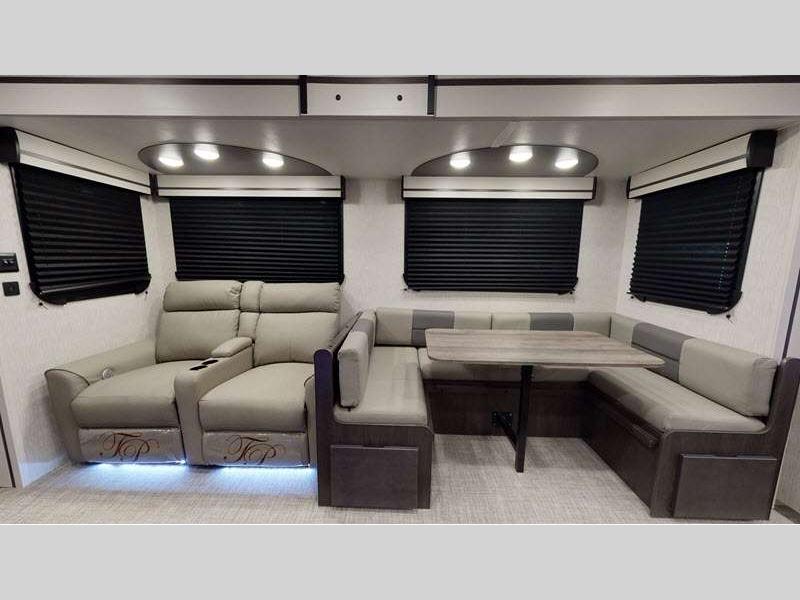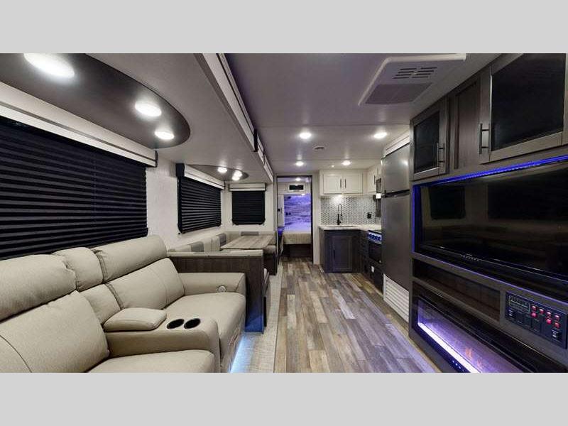 Sleeps 6 Slides 2 Length 34 ft 11 in Ext Height 11 ft 4 in Interior Color Breezy Beige, Granite Gray Hitch Weight 830 lbs Dry Weight 7192 lbs Fresh Water Capacity 54 gals Grey Water Capacity 60 gals Black Water Capacity 30 gals Furnace BTU 30000 btu Available Beds King Refrigerator Type 12V Refrigerator Size 10 cu ft Cooktop Burners 3 Shower Size 30" x 36" Number of Awnings 1 LP Tank Capacity 20 lbs Water Heater Type Girard On Demand Gas TV Info LR TV Lift Awning Info Power with LED Lights Axle Count 2 Washer/Dryer Available Yes Number of LP Tanks 2 Shower Type Standard Similar Floorplans
