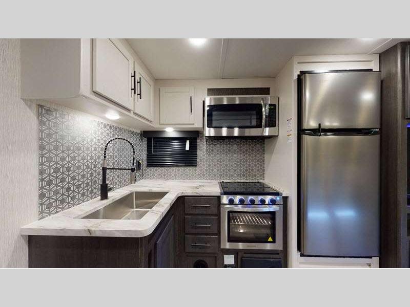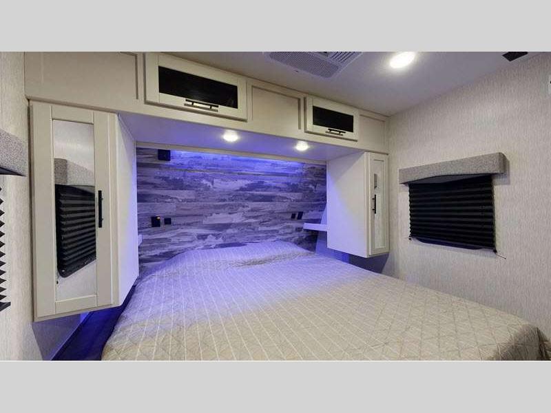 You'll enjoy many at-home comforts inside, such as hardwood cabinet doors, seamless kitchen countertops, a decorative bedspread plus more. The power awning with LED lights will allow you to spend more time outdoors in the fresh air, and the heated pass-through storage will keep all of your camping gear secure.