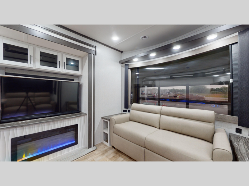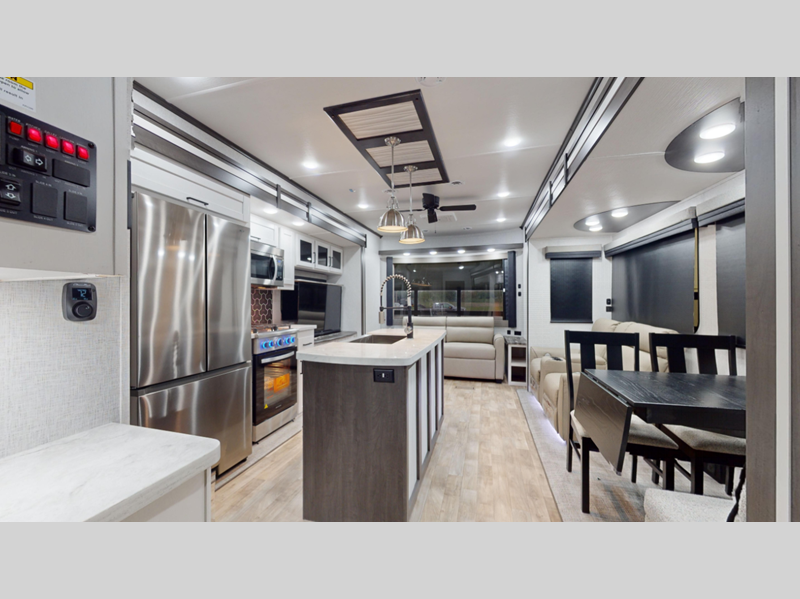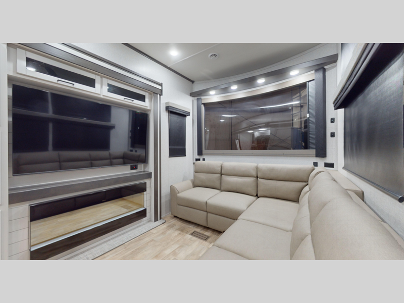 Sleeps 7 Slides 3 Length 41 ft 4 in Ext Height 13 ft 6 in Int Height 9 ft Interior Color Smokey Tan, Steely Grey Hitch Weight 1610 lbs Dry Weight 12057 lbs Cargo Capacity 1553 lbs Fresh Water Capacity 54 gals Grey Water Capacity 80 gals Black Water Capacity 40 gals Tire Size 16" Furnace BTU 35000 btu Available Beds King Refrigerator Type Residential Cooktop Burners 4 Shower Size 48" Number of Awnings 1 Water Heater Capacity 12 gal Water Heater Type DSI Gas/Electric AC BTU 30000 btu TV Info LR 50" LED HDTV on Lift Awning Info 18' Axle Count 2 Washer/Dryer Available Yes Number of LP Tanks 2 Shower Type Standard Electrical Service 50 amp Similar Floorplans