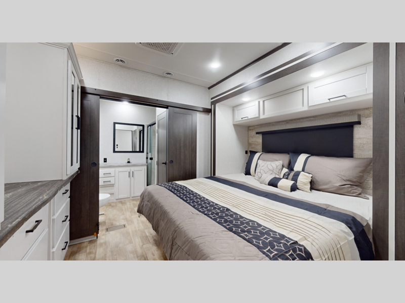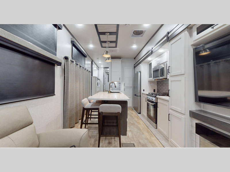 Sleeps 4 Slides 3 Length 43 ft 1 in Ext Height 13 ft 6 in Int Height 8 ft Interior Color Smokey Tan, Steely Grey Hitch Weight 1482 lbs Dry Weight 12168 lbs Fresh Water Capacity 54 gals Grey Water Capacity 40 gals Black Water Capacity 40 gals Tire Size 16" Furnace BTU 35000 btu Available Beds King Refrigerator Type Residential Cooktop Burners 4 Shower Size 48" Number of Awnings 1 Water Heater Capacity 12 gal Water Heater Type DSI Gas/Electric AC BTU 30000 btu TV Info LR 65" LED HDTV Awning Info 18' Axle Count 2 Washer/Dryer Available Yes Number of LP Tanks 2 Shower Type Standard Electrical Service 50 amp Similar Floorplans