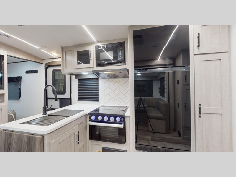Each model features an enclosed and heated underbelly for added protection plus a one-piece seamless super flex roof for added strength. There are also magnetic slam latch doors outside, along with solar power prep, backup camera prep, and a power awning with LED lights. Inside, you'll enjoy the hardwood cabinet doors, solid surface kitchen countertops, a decorative bedspread and many more comforts.