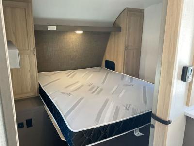 Dual entry doors, sleeping space for nine, and a spacious interior make this model perfect for camping with a larger group! Your crew can relax by the fireplace in the evening on the Lux Lounge, which will convert to sleeping space. There is also a booth dinette that will provide a place to dine each day, as well as a place for more guests to sleep if needed. You can be sure the double-size bunks will be claimed by the littles ones, and the queen bed in the front private bedroom will provide a great night's rest after adventuring in the woods. Whip up your best meals on the three burner cooktop, freshen up in the full bath with its own exterior entry door, grab a cold drink from the exterior refrigerator, and do so much more in this spacious trailer!