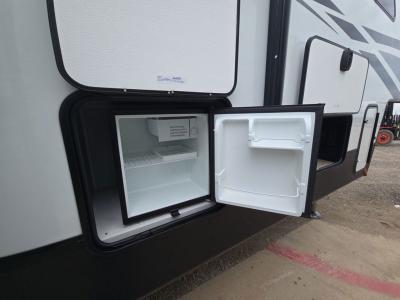 Plan to say awhile in this rear kitchen fifth wheel! You will fall in love with the front bedroom with a king bed slide out, large front closet, a dresser, plus a mounted TV for movies in bed. The rear kitchen includes plenty of space to prep meals, a farm style sink, plus a 10 cu. ft. 12V refrigerator and a pantry for food storage! You can get cozy on the theater seating slide out or at the cafe dinette, and the LED TV will ensure you'll never go bored on rainy days!