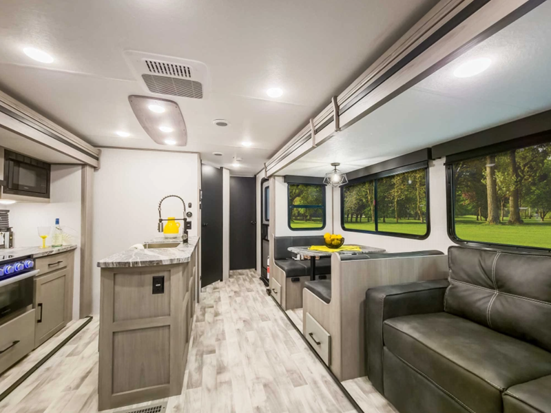Sleeps 3 Slides 2 Length 33 ft 8 in Ext Height 11 ft 1 in Int Height 6 ft 8 in Interior Color Carbon, Savannah Hitch Weight 782 lbs Dry Weight 6732 lbs Cargo Capacity 2948 lbs Fresh Water Capacity 44 gals Grey Water Capacity 78 gals Black Water Capacity 28 gals Tire Size 15" Available Beds King Refrigerator Type 12 Volt Refrigerator Size 10 cu ft Cooktop Burners 3 Number of Awnings 1 LP Tank Capacity 20 lbs Water Heater Type On Demand Tankless TV Info LR LED Flat Screen TV Awning Info Adjustable Power w/LED Lights Axle Count 2 Number of LP Tanks 2 Shower Type Standard Similar Floorplans
