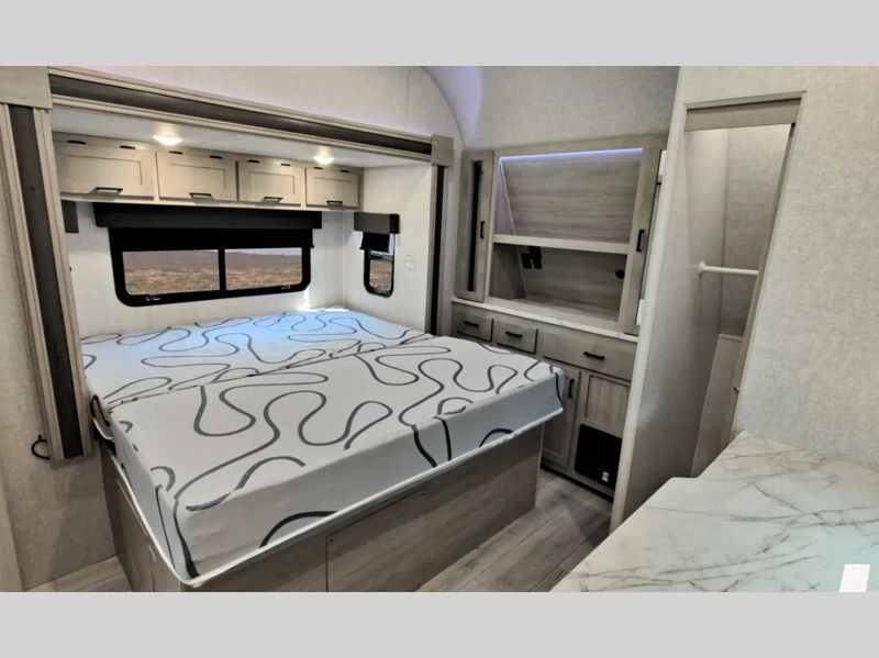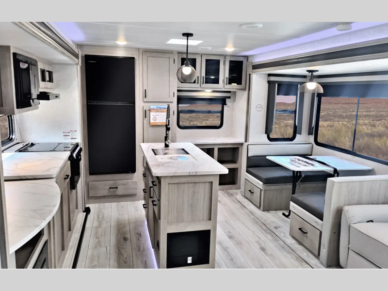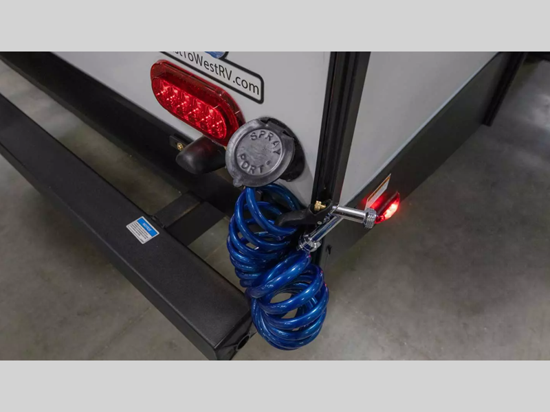You can make yourself at home with solid pressed membrane countertops, interior LED lights, and black roller shades for added privacy. The outside shower with hot and cold water will let you easily wash off camp gear, and the marine grade exterior speakers will allow you to be the life of the campground. You will also appreciate the universal docking station for easy access to your hookups, plus a high-output on-demand tankless water heater for hot water when you need it.
