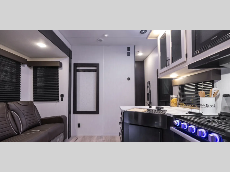 Each model is constructed with an armored underbelly tank enclosure and forced air heat to all holding tanks which will allow you to camp all year long. The outside shower with hot and cold water means you can wash off your toys after trail riding, and the power awning will provide an inviting outdoor space to relax. Inside, you'll enjoy seamless countertops, zebra shades, a tankless on demand water heater, and more convenient features.
