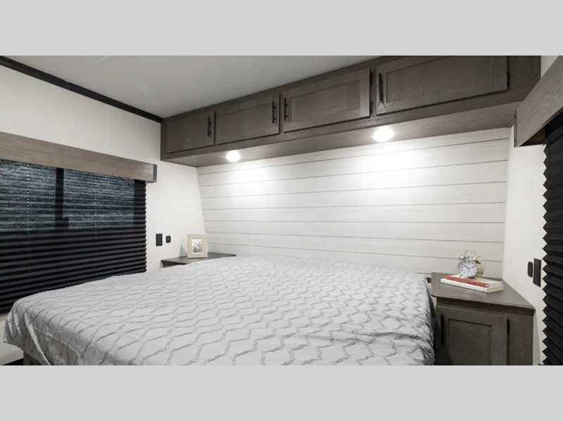 You will love the real wood cabinet doors and drawers inside, along with LED lights and a black stainless steel farm sink that will have you feeling more at home. There are power stabilizer jacks to make your RV more secure, and the power awning with LED accent lighting will create an outdoor space campground neighbors will want to check out.