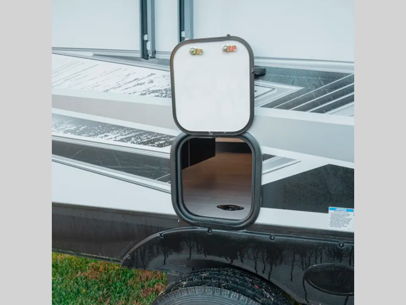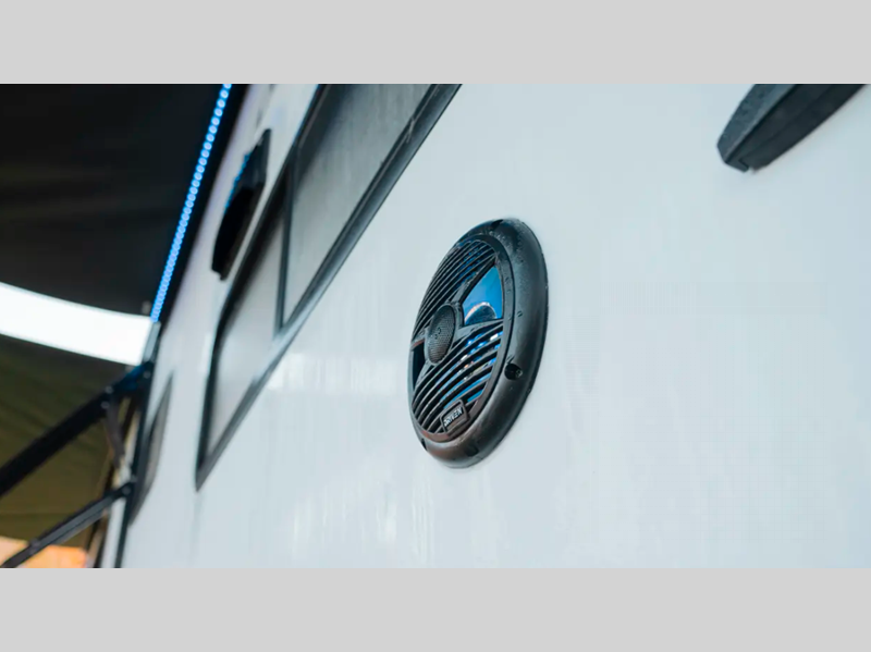You will love the real wood cabinet doors and drawers inside, along with LED lights and a black stainless steel farm sink that will have you feeling more at home. There are power stabilizer jacks to make your RV more secure, and the power awning with LED accent lighting will create an outdoor space campground neighbors will want to check out.