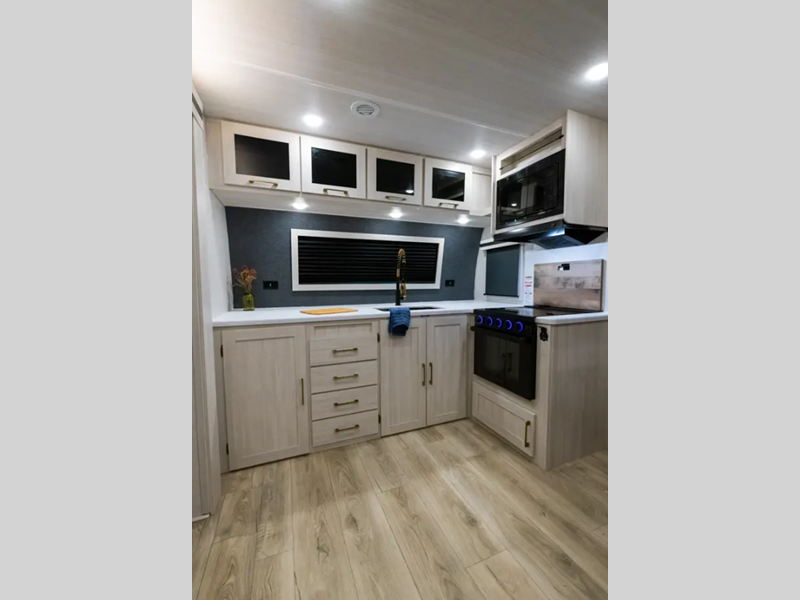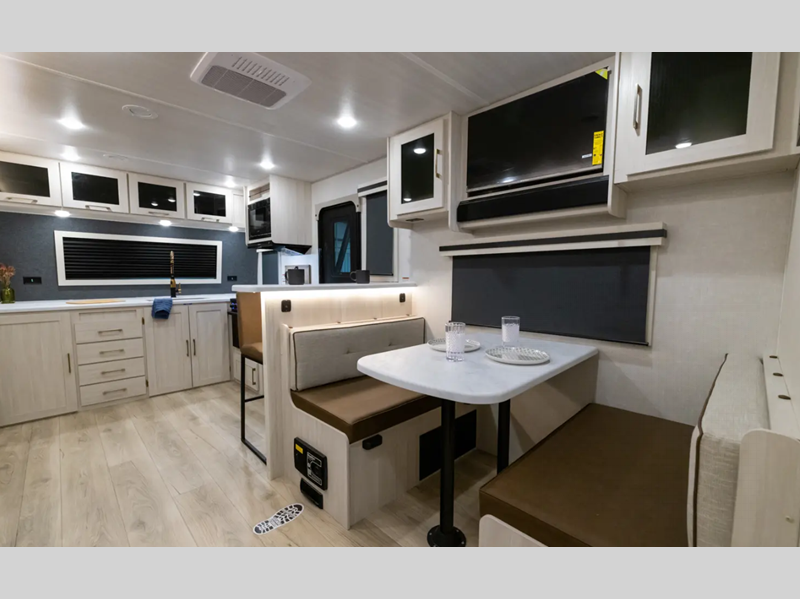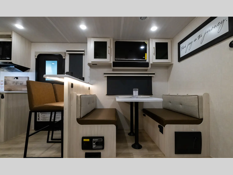 Sleeps 5 Slides 1 Length 31 ft 9 in Ext Width 8 ft Ext Height 11 ft 3 in Hitch Weight 815 lbs Dry Weight 6368 lbs Cargo Capacity 1447 lbs Fresh Water Capacity 40 gals Grey Water Capacity 40 gals Black Water Capacity 30 gals Available Beds Custom King Refrigerator Type 12V Black Glass Refrigerator Size 10 cu ft Number of Awnings 1 Water Heater Type Tankless AC BTU 15000 btu TV Info LR HD TV Awning Info 21' Electric with LED Lights Axle Count 2 Shower Type Standard Electrical Service 50 amp Similar Floorplans