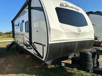 With any Grand Surveyor travel trailer by Forest River you will enjoy turn-key ready-to-go features and quality construction! Each model includes Azdel composite walls and a gel coated fiberglass front cap with an automotive style tinted windshield for a sleek look. There are friction hinge black glass entry door(s), an adjustable platform step with a night light, plus Goodyear tires and a power tongue jack for easy towing. The interior will have you feeling right at home with roller shades, residential faucets, sinks, and bathroom vanity, plus Surf(x) seamless countertops throughout. You can also plan for adventure with a 2" rear accessory and exterior spray port, and there are slam latch exterior baggage doors throughout to keep all your gear secure. Other stand-out features include a central vacuum system, a 200 watt solar panel with a 30 amp controller, a tankless water heater, carpet-free interiors, and the list goes on!