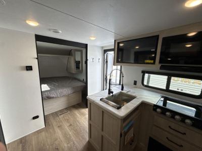 If you're looking for more space, this double axle unit features a large slide so you can walk about freely. Here, you'll find the booth dinette and sofa, which sit across from the optional TV if you want to enjoy movie nights. The full kitchen includes a stainless microwave and three burner cooktop to make meals, plus a pantry and 12V refrigerator for food storage. And an optional outside mini kitchen with a grill can be added if you enjoy cooking outdoors! Your guests or littles are sure to enjoy the rear bedroom with a queen bed, a 28" x 65" bunk, 28" x 76" bunk, a shirt closet, and a wardrobe so everything has a place!