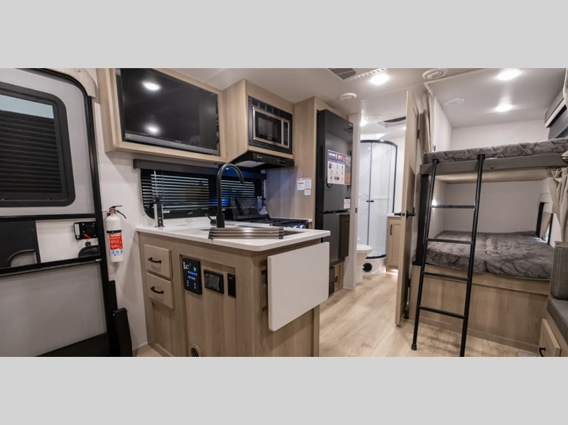 Sleeps 3 Slides 1 Length 22 ft 4 in Ext Width 8 ft Ext Height 10 ft 3 in Hitch Weight 557 lbs Dry Weight 4493 lbs Cargo Capacity 1344 lbs Fresh Water Capacity 54 gals Grey Water Capacity 29 gals Black Water Capacity 29 gals Furnace BTU 20000 btu Available Beds RV Queen Refrigerator Type 12 Volt Cooktop Burners 3 Number of Awnings 1 LP Tank Capacity 30 lbs Water Heater Type Quick Recovery AC BTU 15000 btu TV Info LR 12V TV Awning Info 14' Power with Adjustable Rain Dump and LED Lights Axle Count 2 Number of LP Tanks 2 Shower Type Radius Similar Floorplans