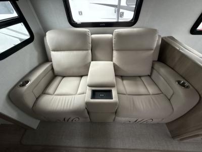When you are outside this trailer you can enjoy the protection from the 21' power awning, you will also find exterior storage for your extra gear, and a ladder at the rear. You get to choose which entrance to step up into, be it the spacious rear bedroom with a queen bed slide and a wardrobe, or the main entry into the kitchen and living area. The furniture slide includes a booth dinette to eat your meals at, and theater seating to watch the Smart TV with a fireplace below. And the cook will love the front kitchen with extra counter space, a three-burner range, plus a 12V refrigerator and pantry for food storage!