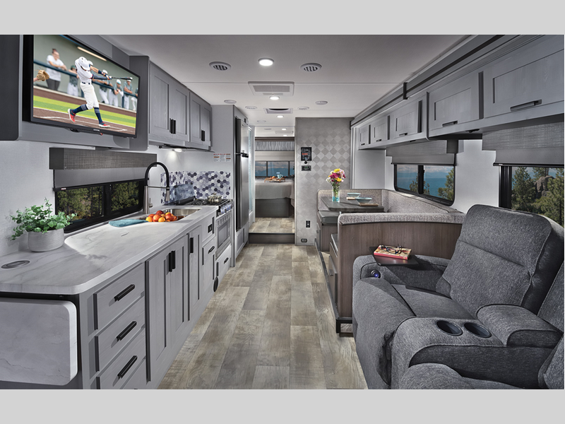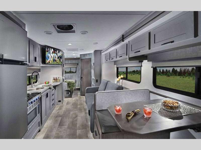 The clean, contemporary interiors will have you feeling right at home with features like comfortable seating and dining, convenient storage space, and a convection microwave. The backup and side view camera system will make it easy to maneuver the road, and the 10" in-dash touch screen Apple Carplay/Android Auto radio will let you enjoy some tunes as you travel.