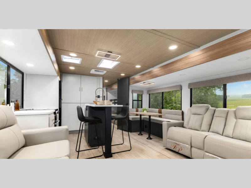 Sleeps 4 Slides 3 Length 39 ft 10 in Ext Width 8 ft Ext Height 11 ft 4 in Int Height 6 ft 8 in Hitch Weight 1120 lbs Dry Weight 8818 lbs Cargo Capacity 2502 lbs Fresh Water Capacity 38 gals Grey Water Capacity 96 gals Black Water Capacity 30 gals Available Beds Custom King Refrigerator Type 12V Refrigerator Size 10.7 cu ft Convection Cooking Yes Cooktop Burners 3 Number of Awnings 1 Water Heater Type On Demand Tankless TV Info LR 50" Smart TV Awning Info 20' Axle Count 2 Washer/Dryer Available Yes Shower Type Standard Similar Floorplans