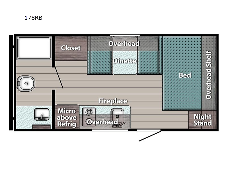 You'll have everything you need in this cozy travel trailer for three; a full rear bath, a two burner cooktop, plus a front bed for a great night's rest. You'll find overhead compartments for your things, plus a closet to keep your clothes wrinkle-free. The fireplace across from the booth dinette will be perfect for those fall camping nights, and the power awning outdoors will provide shade when you're visiting outside.