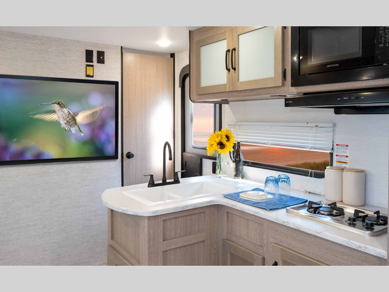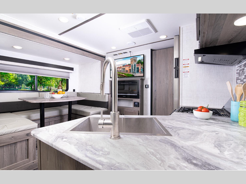 Each one is built with a unibody construction with steel hurricane straps tying the walls to the roof and floor for added strength. You will also find a durable diamond late lower front and a one-piece synthetic vinyl roof. Once inside, you'll enjoy the easy-care vinyl wall coverings, along with the high-performance vinyl flooring throughout and pressed countertops.