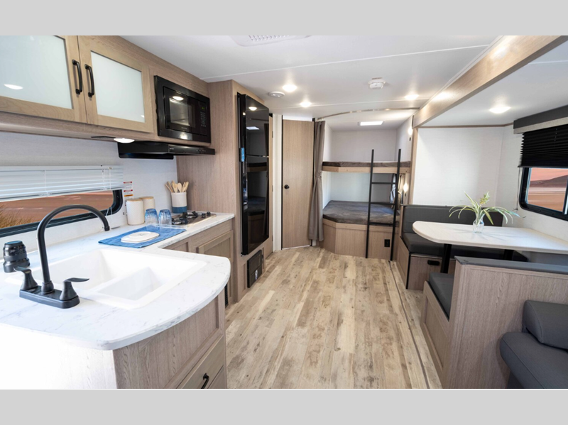 Sleeps 8 Length 30 ft Ext Width 8 ft Ext Height 10 ft 5 in Int Height 6 ft 8 in Hitch Weight 590 lbs Dry Weight 4930 lbs Cargo Capacity 2660 lbs Fresh Water Capacity 35 gals Grey Water Capacity 33 gals Black Water Capacity 34 gals Tire Size 14" Furnace BTU 25000 btu Number Of Bunks 2 Available Beds Queen Refrigerator Type Everchill Refrigerator Size 10.7 cu ft Cooktop Burners 3 LP Tank Capacity 20 lbs Water Heater Type Tankless AC BTU 13500 btu Axle Count 2 Number of LP Tanks 2 Shower Type Tub/Shower Combo Electrical Service 30 amp Similar Floorplans