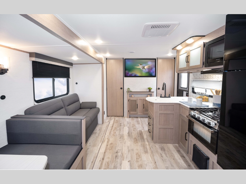 Sleeps 5 Slides 1 Length 28 ft 10 in Ext Width 8 ft Ext Height 11 ft 1 in Int Height 6 ft 8 in Hitch Weight 580 lbs Dry Weight 5050 lbs Cargo Capacity 4330 lbs Fresh Water Capacity 23 gals Grey Water Capacity 36 gals Black Water Capacity 36 gals Tire Size 14" Furnace BTU 20000 btu Available Beds Queen Refrigerator Type Everchill Refrigerator Size 10.7 cu ft Cooktop Burners 3 Number of Awnings 1 LP Tank Capacity 20 lbs Water Heater Type Tankless AC BTU 13500 btu Awning Info Electric with LED Lights Axle Count 2 Number of LP Tanks 2 Shower Type Radius Electrical Service 30 amp Similar Floorplans