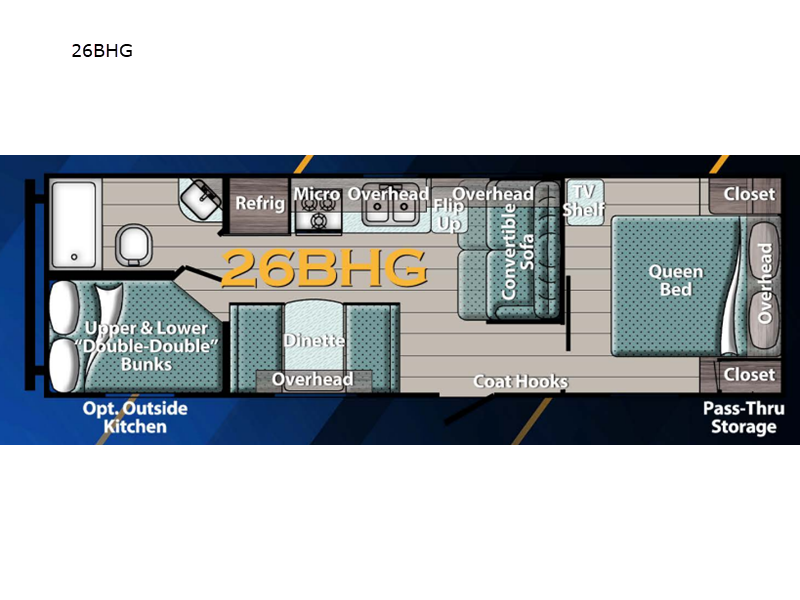 Sleeps 8 Length 30 ft Ext Width 8 ft Ext Height 10 ft 5 in Int Height 6 ft 8 in Hitch Weight 590 lbs Dry Weight 4930 lbs Cargo Capacity 2660 lbs Fresh Water Capacity 35 gals Grey Water Capacity 33 gals Black Water Capacity 34 gals Tire Size 14" Furnace BTU 25000 btu Number Of Bunks 2 Available Beds Queen Refrigerator Type Everchill Refrigerator Size 10.7 cu ft Cooktop Burners 3 LP Tank Capacity 20 lbs Water Heater Type Tankless AC BTU 13500 btu Axle Count 2 Number of LP Tanks 2 Shower Type Tub/Shower Combo Electrical Service 30 amp Similar Travel Trailer Floorplans