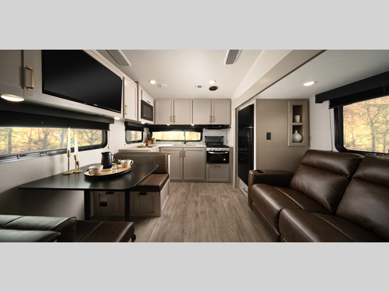 At the heart of every fifth wheel lies the 5 in. TrusstXL Roof System, a hallmark of structural excellence and strength. Each fifth wheel is fortified with ThermaShield, a zero-degree tested weather protection system with a fully enclosed and heated underbelly engineered for the most demanding climates, delivering comfort in frigid conditions. In the interior, you will find USB-C 12V charging ports strategically placed for effortless device charging and power management, plus a shower skylight that infuses the bathroom experience with natural light and openness.