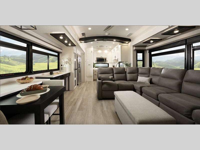 Sleeps 4 Slides 3 Length 43 ft 2 in Ext Width 8 ft 6 in Ext Height 13 ft 3 in Int Height 8 ft 6 in Exterior Color Midnight Charcoal, Midnight Gold, Silver Metallic Hitch Weight 3370 lbs GVWR 18700 lbs Dry Weight 15415 lbs Cargo Capacity 3350 lbs Fresh Water Capacity 75 gals Grey Water Capacity 87 gals Black Water Capacity 50 gals Tire Size 215/75R17.5"H Furnace BTU 40000 btu Available Beds King Refrigerator Type Residential Refrigerator Size 21 cu ft Convection Cooking Yes Cooktop Burners 4 Number of Awnings 2 LP Tank Capacity 40 lbs. Water Heater Type On Demand Tankless AC BTU 30000 btu TV Info LR Smart LED HDTV, BR 32" 4K Smart LED TV, EXT 40" 4K Smart LED TV Awning Info 11' and 21' Electric with multi-color LED Lights Axle Count 2 Washer/Dryer Available Yes Number of LP Tanks 3 Shower Type Walk-In Shower Electrical Service 50 amp Solar Wattage 400 watts Similar Floorplans