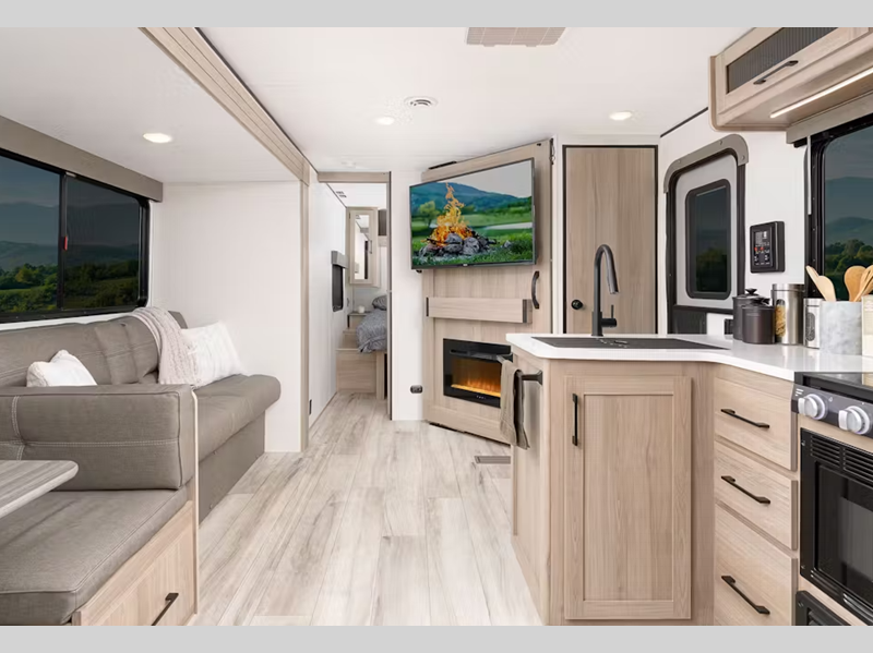 Sleeps 3 Slides 1 Length 29 ft 11 in Ext Height 11 ft 2 in Hitch Weight 710 lbs Dry Weight 6261 lbs Cargo Capacity 1439 lbs Fresh Water Capacity 54 gals Grey Water Capacity 68 gals Black Water Capacity 34 gals Tire Size ST215/75R14D Furnace BTU 35000 btu Available Beds King Refrigerator Type 12V Refrigerator Size 16 cu ft Convection Cooking Yes Cooktop Burners 3 Shower Size 30" x 40" Number of Awnings 1 LP Tank Capacity 20 lbs Water Heater Type Tankless AC BTU 15000 btu TV Info LR 65" LED Smart TV Awning Info 18' Power Number of LP Tanks 2 Shower Type Standard Similar Floorplans