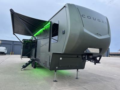 Spend more time having fun and less time worrying about your RV with the Keystone Cougar fifth wheel! These units have all that you will need for excellent vacations. The interior comes hardwood cabinet doors, solid surface kitchen countertops, an Oxygenics shower head and hose, plus a Vent-All window system. You will also appreciate the 12V charging stations throughout, the dual zone Bluetooth audio system, and the on-demand water heater for added comfort. The exterior is also fully outfitted with a convenience center, MaxTurn technology, Lippert axles with anti-lock braking system, and a Curt Road Armor shock absorbing equalizer for smooth towing. Each model is available with the optional Hero Edition. By choosing this edition, you can help support our nation's heros and their families by contributing to the Wounded Warrior Project. This optional package features an industry exclusive full-body paint matte finish, frameless windows, a glass entry door, blackout rims, and green LED exterior accent lighting; see dealer for more details!
